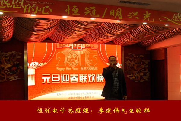 2014年12月31日晚18:15分,明興光元旦聯(lián)歡晚會(huì)在石巖街道旺閣漁村隆重舉行,明興光、恒冠電子企業(yè)領(lǐng)導(dǎo)以及全體職員近200人參加了晚會(huì)。
